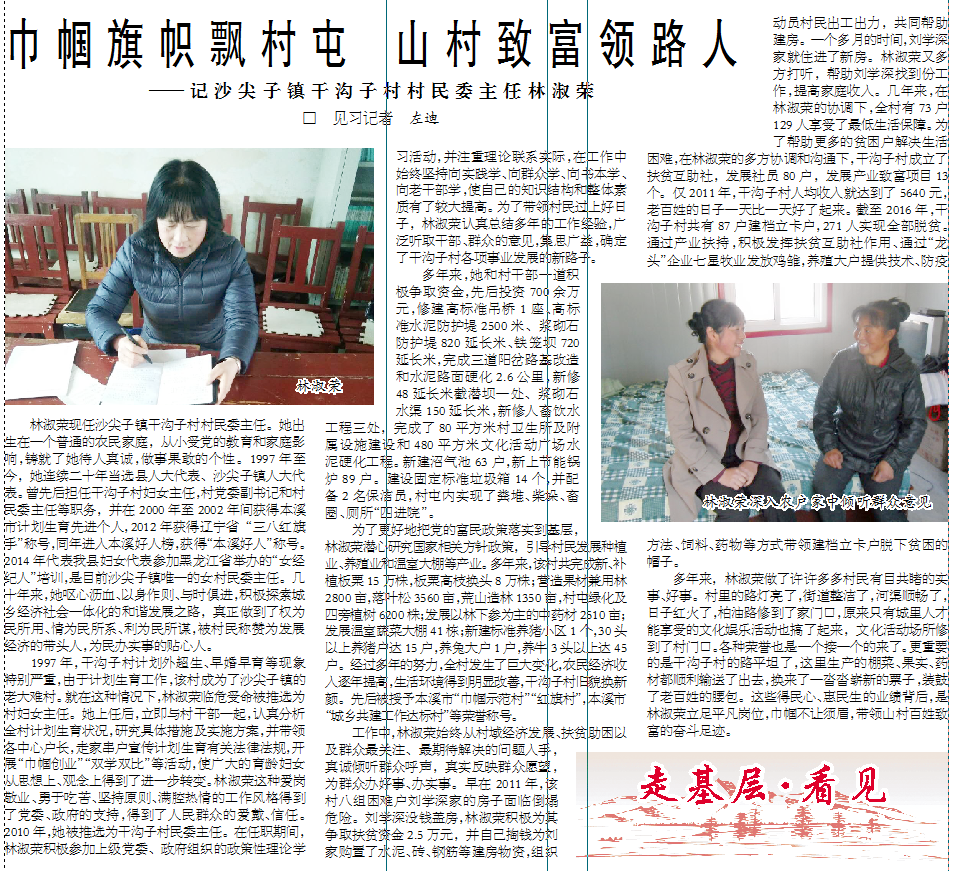 多年来,林淑荣做了许许多多村民有目共睹的实事、好事。村里的路灯亮了,街道整洁了,河渠顺畅了,日子红火了,柏油路修到了家门口,原来只有城里人才能享受的文化娱乐活动也搞了起来,文化活动场所修到了村门口。各种荣誉也是一个接一个的来了。更重要的是干沟子村的路平坦了,这里生产的棚菜、果实、药材都顺利输送了出去,换来了一沓沓崭新的票子,装鼓了老百姓的腰包。这些得民心、惠民生的业绩背后,是林淑荣立足平凡岗位,巾帼不让须眉,带领山村百姓致富的奋斗足迹。