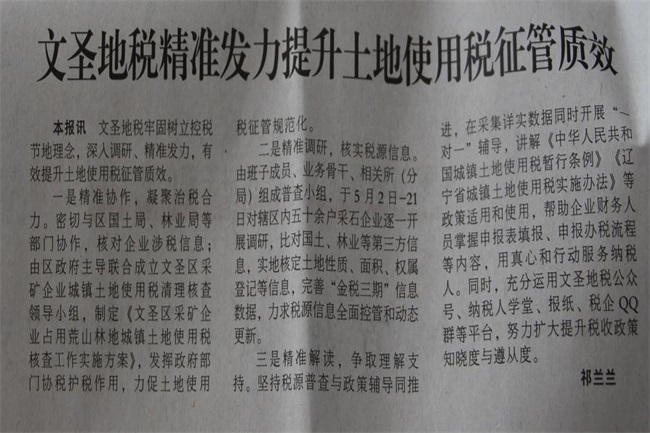 2018年6月8日《辽阳日报》2版刊发《文圣地税精准发力提升土地使用税征管质效》文章。