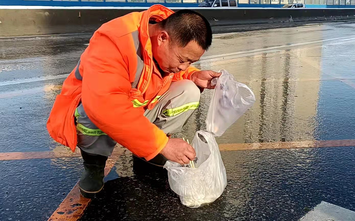 为了节省下午餐的短暂时间,尽快完成除雪任务,环卫工人就地用餐成了习惯。经开区这名环卫工人恰好在高架桥上除雪,拿到盒饭后看周围连靠的地方都没有,干脆直接蹲在地上吃了起来。