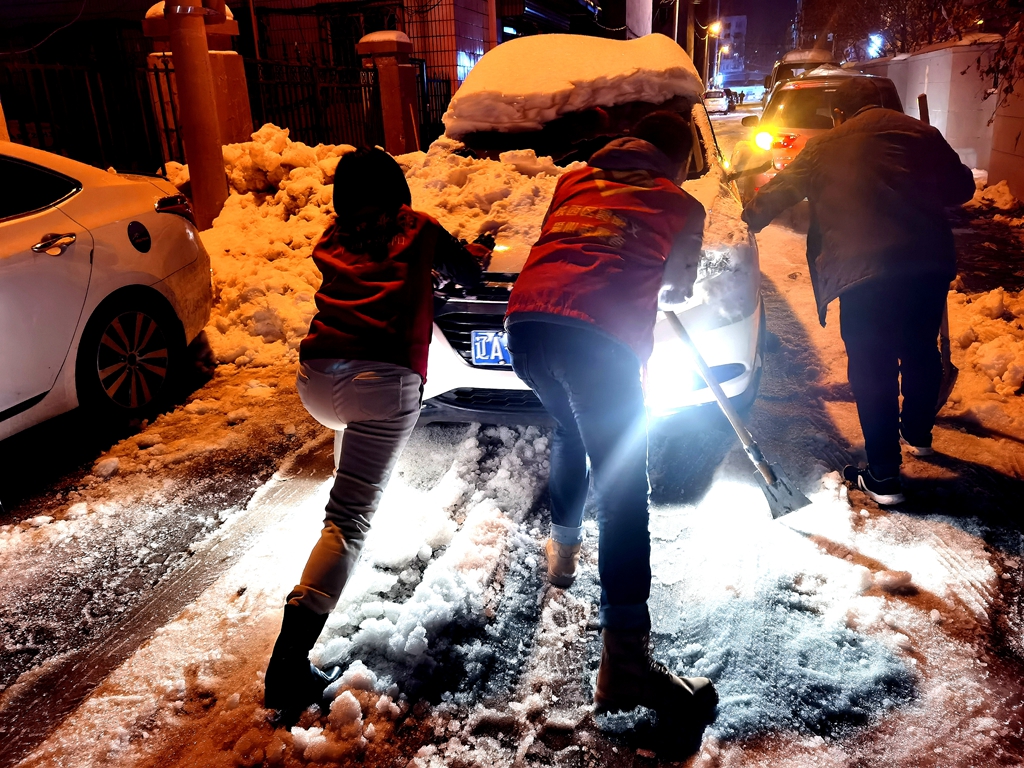 重工街道水源社区志愿者在富工一街附近发现一位车主爱车深陷雪地,见他非常着急,大家一起动手迎着寒风将车推出了雪地。