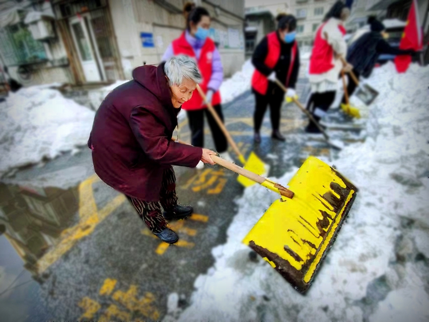 11月13日,家住花园小区82岁高龄的老党员李秀琴主动加入工人新村二社区除雪队伍,她拿起了最大的工具,有力的推着雪,感染和鼓舞着身边的志愿者。