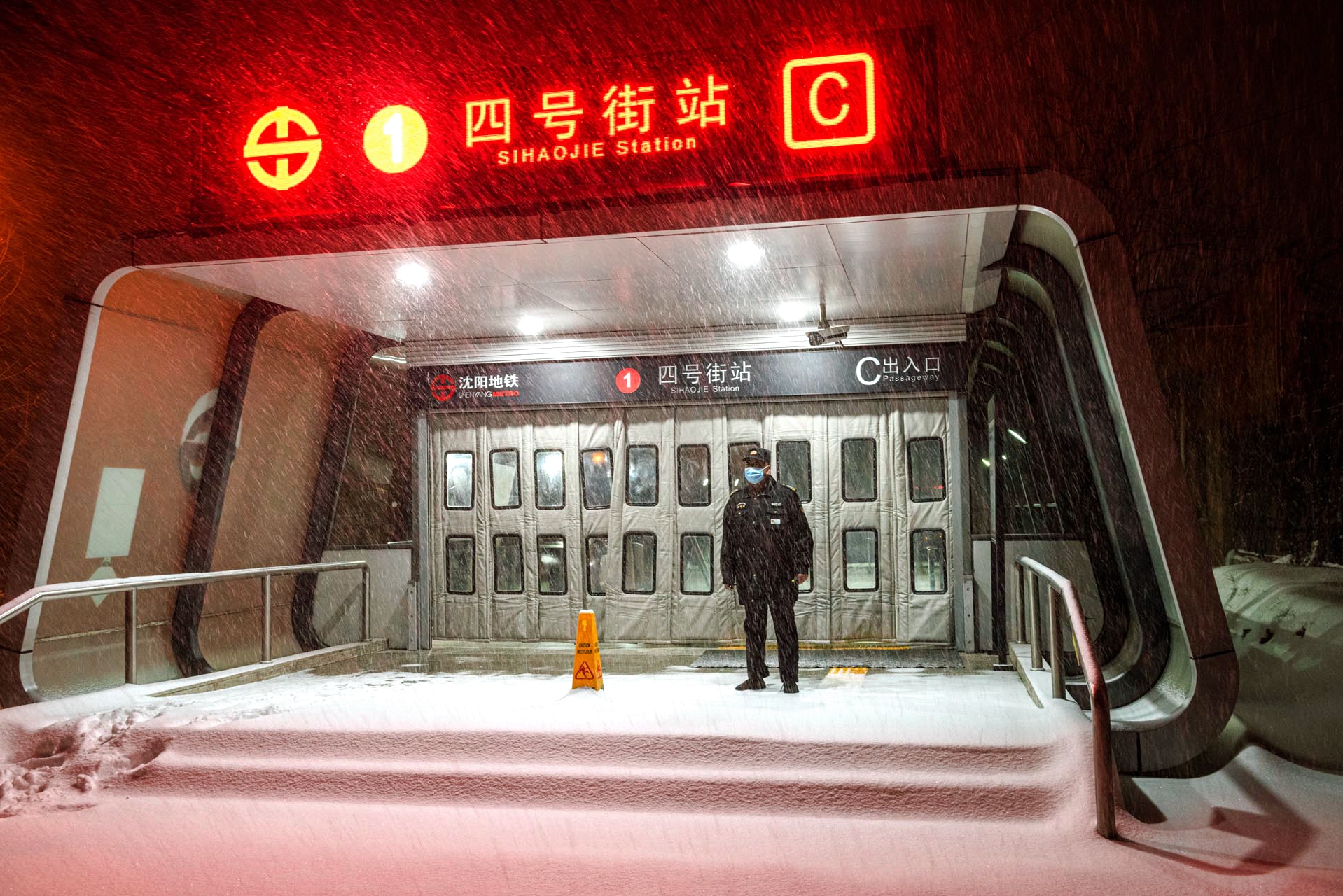 风雪中不动安如山。为了市民乘车安全,地铁站工作人员提前上岗,守候在出入口。安保人员说:“我站在这里迎接今天的第一位乘客,我的同事将在这里安全送离最后一名乘客。”