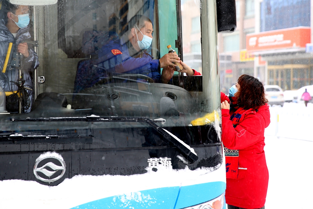 11月8日清早雪还未停,天地白茫茫一片。铁西区爱心企业工作人员将一瓶瓶冒着热气儿的暖心热饮分发到坚守在岗位上的人们手中。