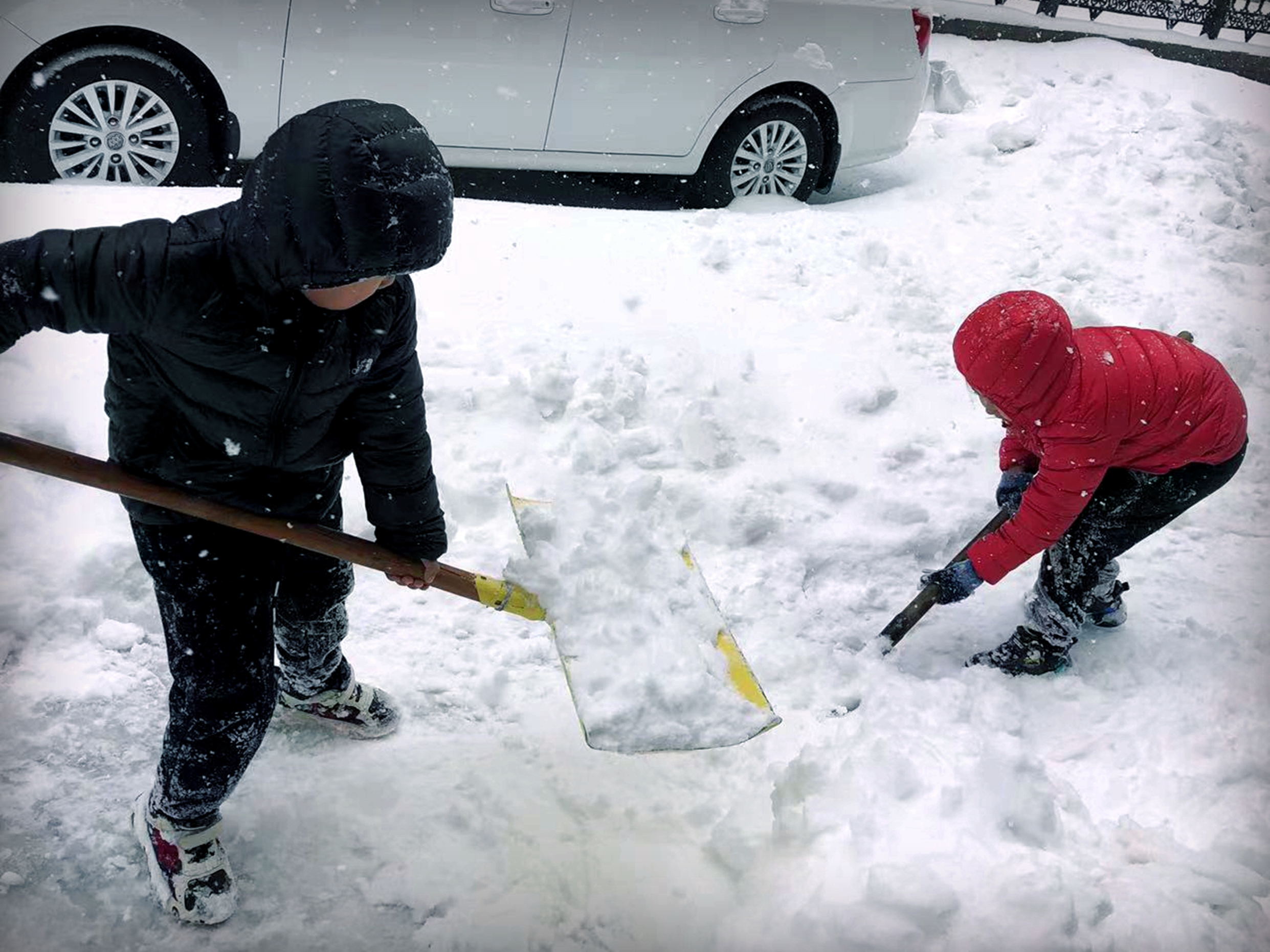 刚刚上完学校网课的双胞胎急匆匆的穿好衣服,跑到自己昨天规划的“分担区”除雪。两个坚定又可爱的身影在雪地里奋战一个多小时,在小区里铲出了一条小道,越铲越宽。看着自己的劳动成果,两个孩子你一言我一语,满脸兴奋。