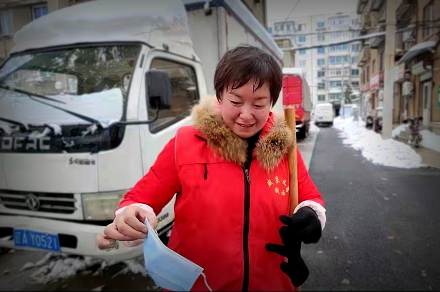 兴顺街道神瑞社区志愿者雒兴梅,为辖区背街小巷清理完厚重的积雪后,汗水浸透了发梢,水雾挂满了口罩,头上蒸腾着热气,看着滴水的口罩,露出了欣慰的微笑。