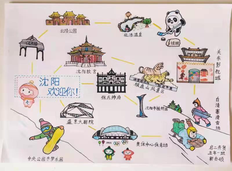 孩子们以思维图的形式设计一份份旅游锦囊献给来自世界各地的冬奥健儿们,发出热情的邀请:中国欢迎你,北京欢迎你,沈阳欢迎你!