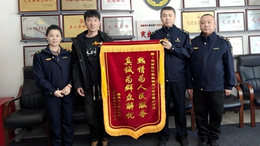 这面锦旗来自兴华街六马路的两家商户,此前他们因店铺招牌制作事宜起了争执,铁西区执法分局得知消息后,执法人员现场细致地向商户讲解牌匾设置的规范标准,用春风化雨般的柔性服务,成功化解了这场矛盾。商户被执法人员的专业与热忱所打动,特意送上锦旗。